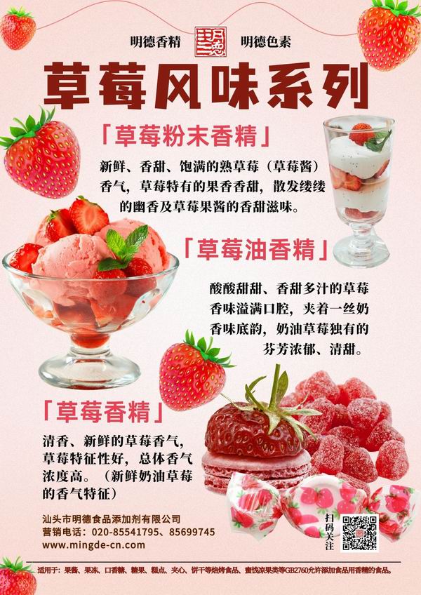 在草莓香精領(lǐng)域我們數(shù)十年潛心專(zhuān)研,迎合市場(chǎng)需求,滿(mǎn)足消費(fèi)者喜好,汕頭市明德食品添加劑有限公司,推出了多種風(fēng)味的草莓香精,如:草莓醬風(fēng)味、奶油草莓風(fēng)味、新鮮草莓風(fēng)味、熟草莓風(fēng)味等。