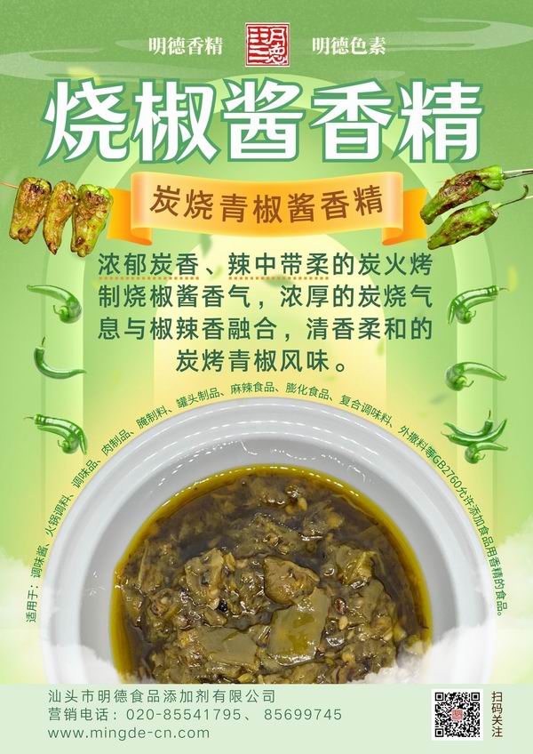炭火烤制燒椒醬風(fēng)味 應(yīng)用于拌飯醬、辣醬中,炭烤香與青椒辣椒香結(jié)合,辣中帶柔,清香柔和,醬香十足,香氣撲鼻。明德 燒椒醬香精 耐溫性好、適用性廣、融合度高、香味醇厚。產(chǎn)品參數(shù)