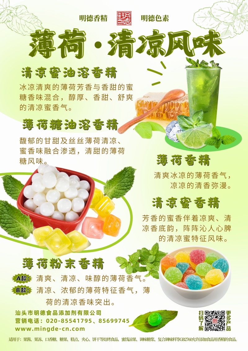 明德薄荷清涼風(fēng)味香精 清涼薄荷 覆蓋糖果飲品場(chǎng)景汕頭市明德食品添加劑有限公司推出的薄荷·清涼風(fēng)味香精系列,涵蓋清涼蜜油溶香精、薄荷糖油溶香精、薄荷香精、清涼蜜香精、薄荷粉末香精等多種調(diào)性。產(chǎn)品清涼舒爽、香氣真實(shí),適用于糖果、飲料、口香糖、烘焙食品及復(fù)合調(diào)味等B端應(yīng)用,幫助工廠快速打造沁人心脾的清涼薄荷風(fēng)味。